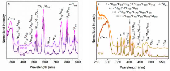 Luminescence excitation spectra of all studied compounds are presented in Figure 2. On the spectra, in the spectral range of 250–320 nm, a band corresponding to a π* ← π-type ligand absorption is present. In addition, bands of small half-width corresponding to 4f* ← 4f-type transitions are visible on the excitation spectra. Energy transfer requires spectral overlap between donor emission and acceptor absorption. It can be seen that all the studied LnIII ions have numerous absorption transitions in the ligand phosphorescence spectral range (ligand phosphorescence in the range of about 370–550 nm [20]). The LnIII transitions are described based on data developed by Carnall [28]. The highest relative ratio of the intensity of ligand absorption to 4f* ← 4f transitions is observed for SmIII and TmIII, indicating the occurrence of the most efficient energy transfer for these compounds (Figure 2b,d). Taking into account selection rules [29], the intramolecular energy transfer from T1 can occur to several SmIII levels and to the 1G4 TmIII level by multipolar (dipole–2λ pole and dipole–dipole) mechanisms (|J − J’| |J + J’|, J’ = J = 0 are excluded). In addition, energy transfer for PPh4[SmL4] can also be mediated through an exchange mechanism ( J’ = J = 0 are excluded in the case of ligand-to-metal energy transfer). It should be emphasized that intramolecular energy transfer from S1 to 1D2 TmIII cannot be excluded. The PPh4[TmL4] excitation spectra presented in Figure 2d were the result of monitoring at 776 nm emission. Other excitation spectra were obtained from the monitoring of 1G4 → 3H6 emission (λem = 472.5 nm (293 K); λem = 480.2 nm (77 K)). An additional broad band in the 340–420 nm range appeared (Figure S4). Identical results were obtained using different equipment and applying appropriate filters. The intensity of the broad band increases at 77 K. This result is unexpected and requires further study. The ligand absorption bands’ positions nearly coincide in the excitation and diffuse reflection spectra of the compounds (Figure S5). As can be seen in Figure S5, the profile of the reflectance spectra is the same for coordination compounds PPh4[GdL4] and PPh4[TmL4].