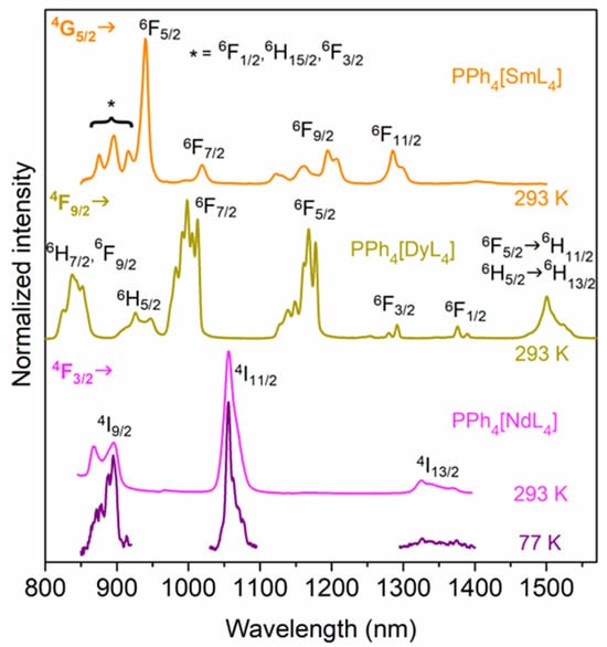 Luminescence spectra of PPh4[NdL4], PPh4[SmL4], and PPh4[DyL4] (NIR emission) in single-crystal form at 293-77 K and 293 K, respectively.