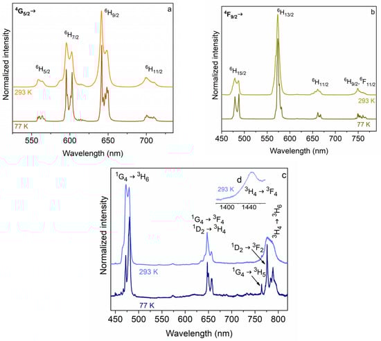 Luminescence excitation spectra of (a) PPh4[NdL4] λem = 1055.4 nm; (b) PPh4[SmL4] λem = 637 nm; (c) PPh4[DyL4] λem = 574 nm; and (d) PPh4[TmL4] λem = 776 nm in single-crystal form at 293 and 77 K.