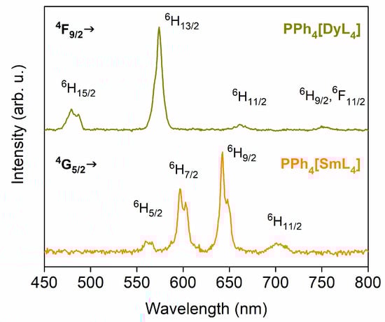 All compounds show emission after ligand excitation with 285–300 nm radiation at room temperature and 77 K. Coordination compounds PPh4[SmL4], PPh4[DyL4], and PPh4[TmL4] demonstrated dual NIR (Figure 3) and visible (Figure 4) luminescence. The neodymium complex PPh4[NdL4] has shown f-f emission typical of NdIII ions in the NIR region upon excitation of the sample by UV light of a 280 nm wavelength (Figure 3).
