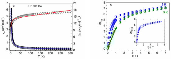 The molar magnetic susceptibility for PPh4[NdL4], PPh4[DyL4] and PPh4[TmL4] has been converted to the χMT product, whose temperature dependence is displayed in Figure 6 on the left. The field dependence of the magnetization per formula unit M1 = Mmol/NAµB at constant temperature is shown in Figure 6 on the right.
