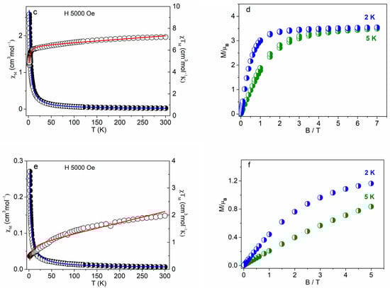 DC magnetic data for PPh4[DyL4] (a,b), PPh4[TmL4] (c,d), and PPh4[NdL4] (e,f). Left: temperature dependencies of χM (•) χMT (ο); right: field dependences of magnetization per formula unit. The solid lines (red and blue) are calculated using the PHI program.
