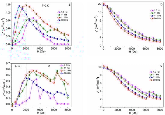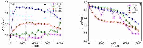 AC susceptibility data were acquired first at T = 2.0 K for a set of representative frequencies of the alternating field (f = 1.0, 11, 1111, and 1116 Hz) by ramping the magnetic field from zero to BDC = 0.8 T or even higher; the working amplitude BAC = 0.3 mT was used. For the examined compounds (Dy, Tm, Nd), there is no absorption signal (out-of-phase susceptibility component χ″) at the zero magnetic field owing to fast magnetic tunneling. The out-of-phase susceptibility χ″ increases with the applied field up to a maximum and then attenuates (Figure 7). The graph shows the regions in which individual frequencies yield the maximum response and indicates that PPh4[DyL4], PPh4[TmL4], and PPh4[NdL4] can exhibit field-induced slow magnetic relaxation.