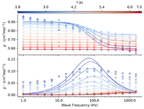 The next scans of mapping magnetic response were conducted at a fixed external magnetic field BDC = 0.2 T (for PPh4[DyL4] and PPh4[TmL4]) and 0.25 T (for PPh4[NdL4]), changing the frequency between f = 0.1 and 1500 Hz for a set of temperatures between T = 1.8 and 7 K. The curves for both PPh4[TmL4] and PPh4[NdL4] display the frequency dependence of magnetic susceptibilities in the out-of-phase mode, but do not show an onset of peaks (Figure S8). The frequency dependences of the AC susceptibility components at different temperatures for PPh4[DyL4] shown in Figure 8 are evidence of one relaxation channel with a well-developed peak at 2 K and BDC = 0.2 T with the maximum located at f = 96 Hz in the out-of-phase susceptibility curve. These data were fitted using CC-FIT2 software [42] by employing the simple Debye model (Table S5). Experimental curves without maxima were omitted. The quality of the fit is controlled by the standard deviation for each parameter and the discrepancy factors R(χ′) and R(χ″). Based upon the fitted parameters, the overall χ′ vs. f and χ″ vs. f curves were calculated, as displayed by solid lines in Figure 8. These pass through the experimental points.