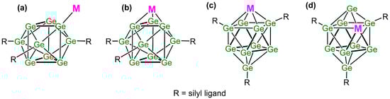 Different binding modes for the metal atom towards silylated cluster species: (a) single Ge–M bond (η1-coordination), (b) capping the triangular face (η3-coordination), (c) capping the square face (η4-coordination), and (d) occupying a vertex of the square (η5-coordination).