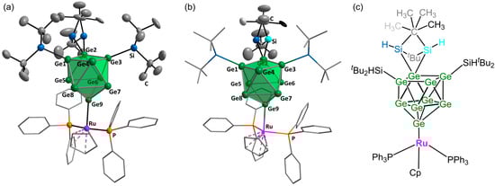 Reaction of [Hyp3Ge9]− comprising the sterically more demanding silyl ligand Hyp with RuCp*(PPh3)2Cl possessing another sterically demanding ligand Cp* leads to [η5-Ge9Hyp3]RuCp* (1) (Scheme 1a). The structure of the cluster was resolved by single-crystal X-ray diffraction, revealing a ten-atom bicapped square antiprismatic [Ge9Ru] cluster core, with ruthenium occupying one vertex of one square. In total, four ligands are bound to the cluster, three silyl ligands are bound to Ge1, Ge3, and Ge9, and the Cp* ligand is bound to Ru (Figure 2). The cluster core, thus, adopts a Cs-symmetric distorted bicapped square antiprism. The Ge–Ge bond distances are in the range of 2.500(1)–3.188(2) Å, with Ge5–Ge9 being the shortest and Ge5–Ge8 being the longest distance. The bond distances in 1 are in good agreement with metalated cluster species known from the literature with metal atoms occupying the same position, such as (η5-Ge9Hyp3Et)MPR3 (M/R = Ni/PPh3, Pptolyl3, PiPr3, PMe3; Pd/PPh3; Pt/PPh3) [26,33,34], (η4-Ge9Hyp3)RhCOD [18,25], and [(η5-Ge9Hyp3)M(CO)3]− (M = Mo, W, Cr) [24], with Ge–Ge distances in the ranges 2.455–2.885 Å, 2.498–3.152 Å, and 2.502(5)–2.824(3) Å, respectively. In addition, the Ru atom has an overall η10-coordination (5 Ge atoms and 5 C atoms), with Ge–Ru bond lengths in the range of 2.579(1)–2.677(1) Å.