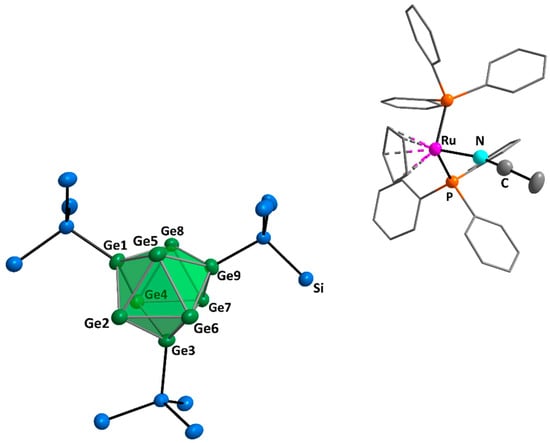 The intermediate product 3a can be further reacted with acetonitrile in C6D6 (Scheme 1c). Thereby, the formation of about 25% of a new compound is indicated by a new singlet for the hypersilyl ligands in the 1H NMR spectrum at 0.65 ppm (Figure S16, Supplementary Materials) and a new signal in the 31P NMR spectrum at 42.4 ppm (Figure S17, Supplementary Materials). Heating 3a in acetonitrile in a sealed NMR tube (Setup Figure S21, Supplementary Materials) gives a light reddish solution in addition to undissolved residues of 3a. In the upper part of the NMR tube at lower temperature, crystals of 3b suitable for single-crystal structure determination formed. Compound 3b consists of a threefold silylated germanium cluster anion with overall C1 symmetry and a ruthenium complex counter ion [RuCp(PPh3)2(MeCN)]+. As in the presence of acetonitrile a change in the NMR spectra of 3a is observed, we assume that the coordinated ruthenium fragment dissociates from the cluster upon coordinating to acetonitrile (Figure 4). Similarly, a compound of [Hyp3Ge9]− with a more complex cation instead of a alkali metal cation was also found in a reaction of the anion with NHC (N-heterocyclic carbene) forming [Hyp3Ge9][NHCDipp-H] [32]. The bond lengths within 3b are in the range of 2.5213(5)–3.6934(4) Å, which is slightly longer than those reported for [Hyp3Ge9][NHCDipp-H], with 2.5154(9)–2.5506(9) Å [32], but similar to those reported for [Hyp3Ge9][K-2.2.2.-crypt], with 2.5237(9)–3.5291(8) Å [8], as well as those observed for 1 and 2. The shortest distance here is Ge1–Ge8 and the longest is Ge6–Ge7. The cluster in 3b possesses D3h symmetry and corresponds to an elongated tricapped trigonal prism, as also observed for K[(SitBu2H)3Ge9] and (η3-Ge9Hyp3)ZnCp* (Table 1) [13,28]. Here, again, Ru has an overall η8-coordination to two P atoms, five C atoms, and one N atom.