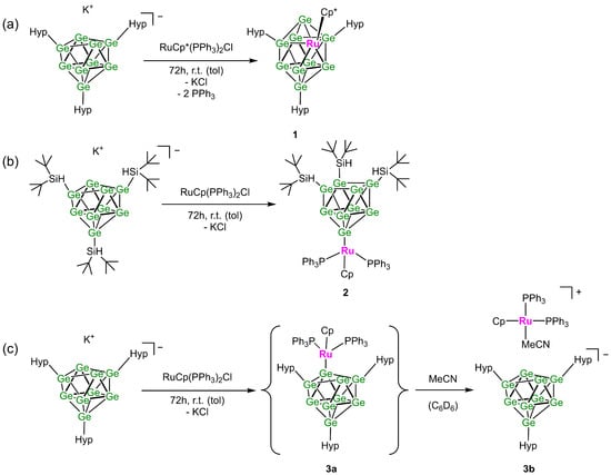Different reactions occurring between silylated clusters and ruthenium complexes: (a) reaction between K[Hyp3Ge9] and RuCp*(PPh3)2Cl to give 1, (b) reaction between K[(tBu2HSi)3Ge9] and RuCp(PPh3)2Cl to give 2, and (c) reaction between K[Hyp3Ge9] and RuCp(PPh3)2Cl to give the ruthenium decorated cluster 3a, which reacts with acetonitrile to 3b.