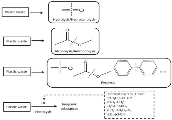 Hydrolysis, hydrogenolysis, alcoholysis, ammonolysis, pyrolysis, and photolysis are the fundamental reactions for the chemical conversion of plastic waste (Figure 1). These reactions break specific chemical bonds in polymers, such as carbon–carbon (C-C) or carbon–oxygen (C-O) bonds, to produce oligomers, monomers, or other small molecules (Figure 1). For example, hydrolysis and hydrogenolysis can target carbonyl groups in PC, while alcoholysis and ammonolysis primarily act on ester bonds (Figure 1) [21,55]. According to some researchers, C=C bonds were introduced from C2H4 to dehydrogenate PE [18,24]. For the pyrolysis process, the stability of molecular groups in plastic polymers varies across different temperature ranges, leading to the formation of diverse molecular groups and a wide variety of products. During the photolysis of plastic waste, photocatalysts absorb light energy and undergo electron transitions, forming electron–hole pairs. These pairs react with hydroxide ions to generate highly reactive hydroxyl radicals, which then oxidize the plastic waste into inorganic substances (Figure 1). However, the types of radicals formed may vary depending on the specific processes. The result obtained by Kong et al. [54] showed that electron–hole pairs could abstract a hydrogen atom from C-H bonds of PE to produce a long-chain alkyl radical, which formed an aminyl radical with the addition of DIAD. In a different approach, Zeng et al. [48] used UV light to promote the bromination of PE instead of its direct photolysis, presenting an alternative light-driven strategy. Carbonyl groups in polymers can induce Norris type I and type II reactions upon absorption of light [56]. Polymers containing carbonyl groups undergo Norris type I reactions and form acyl and alkyl radicals [56]. Carbonyl groups in polymers with gamma hydrogen undergo Norris type II reactions, where gamma hydrogen molecules transfer to oxygen to form 1,4-bis radicals [56].