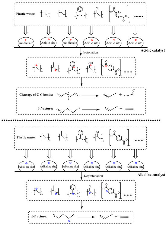 Catalysts play a pivotal role in the chemical conversion of plastic waste, facilitating its efficient transformation into hydrocarbons with a narrow distribution by altering activation energy and regulating reaction kinetics. The pore structure and pH of the catalysts can significantly affect the catalytic performance. During pyrolysis, for instance, carbon-positive ions are generated through acid catalysis, thereby promoting the cleavage of C-C bonds in plastic polymers (Figure 2) [57]. Among various catalysts, zeolite molecular sieves, i.e., solid acid catalysts composed of Si/Al with well-ordered pores, exhibit unique catalytic activity towards C-C bond cleavage. During pyrolysis, long-chain hydrocarbons are initially produced, followed by β-fracture of the long polymer chains under the action of acidic sites in zeolite molecular sieves or other carbocations (Figure 2), ultimately yielding gas and liquid products with specific carbon distributions. Smaller zeolite molecular sieves can increase the heat transfer rate, reaction rate, and oil yield [58]. Furthermore, Xie et al. [59] reported that microporous structures favored small-molecule gas products such as ethylene and propylene, and mesoporous structures promoted macromolecular products such as aromatics. For the pH of zeolite molecular sieves, it was reported that the acidity of the catalyst was higher when the ratio of silicon and aluminum was lower, leading to higher yields of light gaseous hydrocarbons and liquid aromatic hydrocarbons [59]. Activated carbon, another effective catalyst, also relies on its acidity for catalytic activity. During its production, functional groups such as C=O and -OH are generated, forming Brønsted acid sites that facilitate the cleavage of C-C and C-H bonds, resulting in lighter hydrocarbons [57]. Simultaneously, dehydrogenation at Lewis sites promotes the aromatization of products [57]. Alkali metal oxides and transition metal oxides can also catalyze the pyrolysis process. They possess active alkaline sites that attack hydrogen atoms on polymer chains, forming carbon negative ions, which then undergo β-fracture to produce light hydrocarbons (Figure 2). Metal carbonates, which decompose into metal oxides with active alkaline sites upon heating, have been used to catalyze the pyrolysis of plastic polymers, enabling depolymerization through catalytic pyrolysis [60,61,62,63]. In addition to the carbocation mechanism, researchers have proposed that catalytic cracking of plastic waste followed the free radical mechanism [64]. Free radical initiation, chain reaction and termination reaction occurred in the pyrolysis process. Researchers have reported that an environment rich in H∙ was formed on the surface of the catalyst when hydrogen and Fe/AC were present in the system [64]. H∙ reacted with the free radicals produced by the cracking of polyethylene [64]. The pyrolysis of plastic waste often produces harmful aromatic compounds such as benzene, aniline, and their derivatives. To address this issue, researchers have used nickel catalysts to convert the hazardous chemicals produced from pyrolysis into value-added syngas [59].