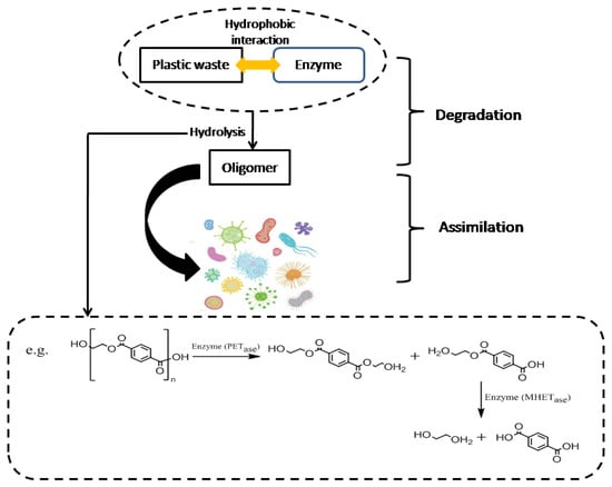 The biodegradation of plastic waste involves two main mechanisms: degradation and assimilation (Figure 4). Microbial enzymes, either extracellular or intracellular, produced by microorganisms such as algae, bacteria, fungi, and actinomycetes are responsible for depolymerizing or decomposing plastic waste [77]. Among these enzymes, hydrolases play a crucial role by cleaving chemical bonds in the presence of water. When hydrolase acts on a product (A-B), the reaction typically follows Equation (1). Plastics found in the environment are generally hydrophobic [78]. The breakdown of plastic waste by hydrolases occurs in two steps. First, extracellular microbial enzymes adhere to the surface of plastic waste via hydrophobic interactions (Figure 4). The hydrophobic clefts in the active sites of these enzymes interact with hydrophobic groups on the plastic, improving the accessibility of the enzyme to the material. In the second step, the enzyme’s active sites hydrolyze specific chemical bonds within the plastic polymers, breaking them down into oligomers or small molecules that microorganisms can utilize as a carbon source (Figure 4).