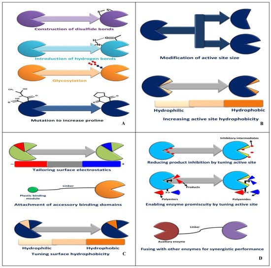 The mechanism of improving the performance of plastic-degrading enzymes. (A) Enhancing the thermal stability of enzymes; (B) enhancing the attachment of plastic waste to the active sites of enzymes; (C) enhancing the interaction between plastic waste and the surface of enzymes; (D) refining additional functions of enzymes (modified from [78]).