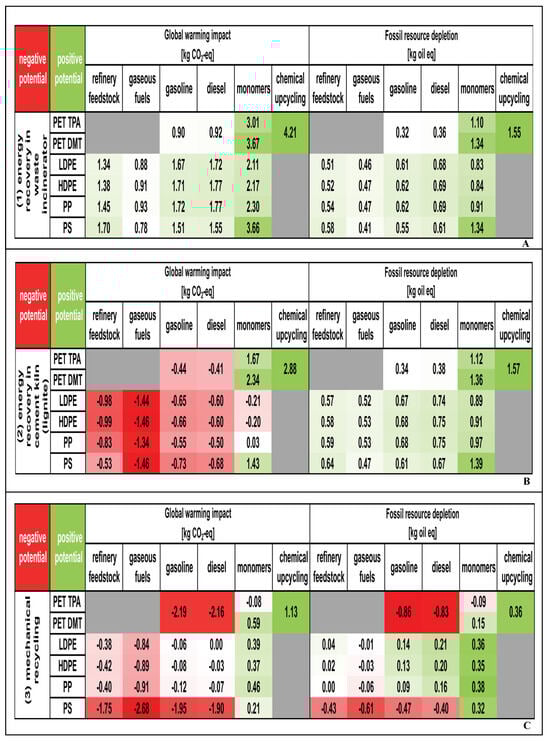 Comparison of the environmental potential of chemical recycling and other recycling methods. (A) Energy recovery in municipal solid waste incinerators; (B) energy recovery in cement kilns; (C) mechanical recycling (Modified from [129]). Red represents negative environmental potential. Green represents positive environmental potential. White represents values equal to zero. Gray represents that chemical recycling has been omitted.