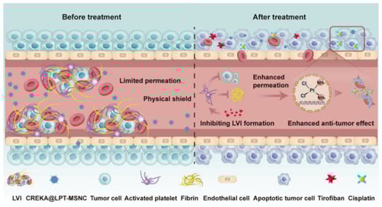 Schematic illustration of the CREKA modified, cisplatin-loaded silicasome (CREKA@LPT-MSNC) treatment to prevent LVI and improve the response of the tumor cells to the chemotherapeutic drug. Reprinted with permission from reference [28]. Copyright © 2024 American Chemical Society.