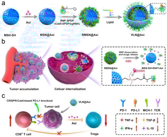 Schematic illustration of the synthesis of VLN@Axi (a) and delivery process (b) after intravenous injection. (c) Schematic illustration of VLN@Axi to revert the exhaustion of CD8+ T cells and suppress Tregs for efficient cancer immunotherapy. Reprinted with permission from reference [87]. Copyright © 2020 Elsevier.