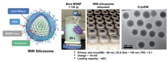 Schematic representation of structure, large-batch synthesis, and characterization via CryoEM of IRIN silicasome developed by Liu et al. Reprinted with permission from reference [90]. Distributed under the terms of the Creative Commons Attribution-Noncommercial-Noderivatives 4.0 International license. Copyright © 2021Wiley-VCH GmbH.