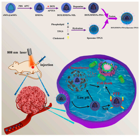 - Fan, C.; Wang, X.; Wang, Y.; Xi, Z.; Wang, Y.; Zhu, S.; Wang, M.; Xu, L. Fabricating a PDA-Liposome Dual-Film Coated Hollow Mesoporous Silica Nanoplatform for Chemo-Photothermal Synergistic Antitumor Therapy. Pharmaceutics 2023, 15, 1128. [Google Scholar] [CrossRef]
