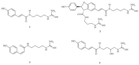 p-Coumaroylhydroxyagmatine 4 differs from 1 by the presence of a hydroxyl group on the agmatine chain (Figure 1). It has been isolated from barley leaf (Hordeum vulgare L.) where it is produced in response to stress conditions such as pathogen infection or climatic conditions [15]. p-Coumaroylagmatine 1 and p-coumaroyl-3-hydroxyagmatine 4 have been reported to exhibit antifungal activity [16] (Figure 1).