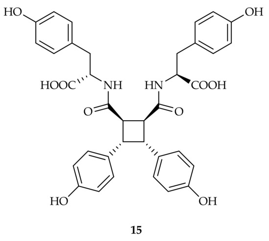p-Coumaroyltyrosine 5 is the major compound in the leaves of Abri herba, identified in amounts ranging from 0.75 to 6.36 mg·g−1, depending on the origin of the samples. It is also found in Abrus mollis and Abrus cantoniensis, whose leaves are rich in amides [26]. Abrus mollis leaves are also rich in other compounds, with truxillate and truxinate skeletons having a characteristic cyclobutane ring derived from the [2 + 2] dimerization of both cis- and trans-p-coumaroyltyrosine 5. Figure 4 shows the structure of one of these compounds, named Abrusamide A 15, whose configuration was recently reassigned [27]. One of the isomers of Abrusamide A 15 has also been identified in Coffea canephora by LC-MS, while it seems to not be present in Coffea arabica [4].
