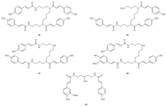 Tetra-coumaroylspermine 45 is also an active component in Coreopsis tinctoria, known in China as “snow chrysanthemum”, used to prepare a flower tea with antioxidant and antidiabetic activities [68]. The compound is also present in Xiaoheiyao, the rhizome of Inula nervosa Wall., a spice used in Chinese food preparations. It has been demonstrated that beef patties marinated with the spice produce lower amounts of carcinogenic aromatic heterocyclic amines when grilled, in comparison to untreated meat. This is due to the electrophilic capture of the precursor creatinine by the p-coumaroyl derivative [69].