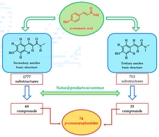 Scifinder® (Washington, DC, USA) was the main source of bibliographic information. Secondary and tertiary amides of p-coumaric acid were identified and retrieved based on the structural formulas depicted in Scheme 1.