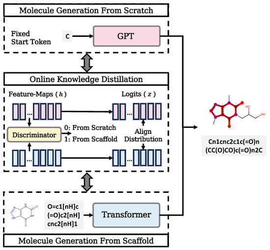 To combine the strengths of the language generative models and the scaffold-based molecular generation methods and solve the above limitations, we proposed an Online knowledge distillation framework for learning unconditional Molecule Generation (OMG). The OMG architecture comprises two models: a GPT model that generates a SMILES string of a complete molecule from scratch (OMG-GPT) and a Transformer model that generates the SMILES string of a molecule from its scaffold (OMG-SG). The above two models mutually learn to generate the same molecules by aligning their feature maps and logits, respectively. This mutual learning strategy enables the integration of scaffold information into the GPT model, thus enhancing the language model’s awareness of key molecular structures while preserving its capacity to generate novel molecules.