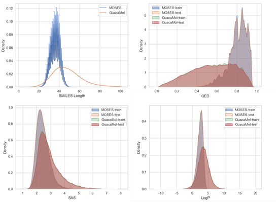 Probability distributions of properties, including SMILES Length, QED (Quantitative Estimate of Drug-likeness), SAS (Synthetic Accessibility Score), and LogP (Octanol–Water Partition Coefficient) of molecules in the MOSES and GuacaMol datasets.