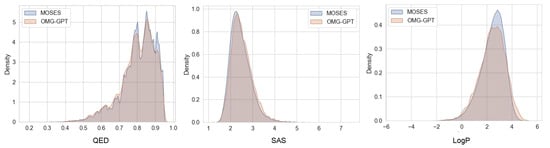 Comparison of the QED (Quantitative Estimate of Drug-likeness), SAS (Synthetic Accessibility Score), and LogP (Octanol–Water Partition Coefficient) distributions for molecules in the MOSES train set and those generated by OMG-GPT (10,000 molecules).