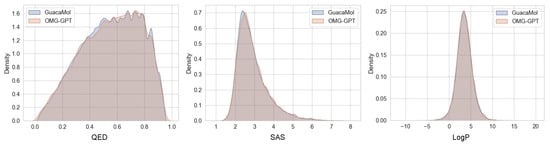 We assess the chemical properties (QED, SAS, LogP) distribution fitting performance of OMG-GPT on the MOSES and GuacaMol datasets. Specifically, we first calculated the values of 10,000 generated molecules and the original molecules for each property, then plotted kernel density estimation curves. Finally, we compared the proximity of the property distribution curves of the two sets of molecules to assess the OMG-GPT’s performance in learning the chemical property distribution. The comparison of the curves on the MOSES and Guacamol datasets is shown in Figure 3 and Figure 4.