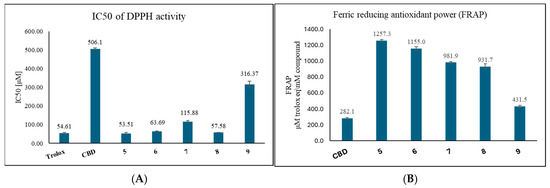(A) IC50 of the tested compounds (CBD and 5–9) in DPPH radical scavenging activity. IC50 values are expressed as mean ± SD of the three independent experiments in triplicates. (B) Ferric-reducing antioxidant power (FRAP) assays for estimating antioxidant activities of the tested compounds (5, 6, 7, 8, 9, and CBD). Data are presented in trolox equivalent (TE) (1 mM of the tested compound is equivalent to X µM (values shown as bars) of trolox).