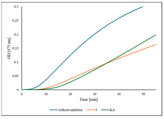 The time-dependent changes in OD at 475 nm correspond to the formation of L-dopaquinone. Blue line: control. Orange line: 20 μM of compound 5. Green line: 20 μM of KA.