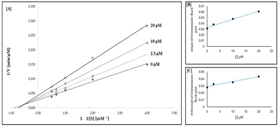 Tyrosinase activity for compound 5: (A) Lineweaver–Burk plot; (B) slope of the Lineweaver–Burk plot as a function of inhibitor concentration; (C) intercept of the Lineweaver–Burk plot as a function of inhibitor concentration.