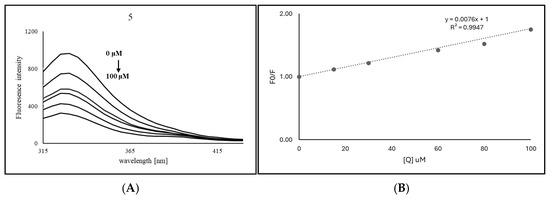 (A) Fluorescence quenching of TYR at λex = 280 nm in increasing concentrations of 5 at 310 K. (B) Stern–Volmer plot.