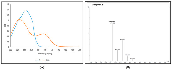 (A) UV-Vis spectrum of compound 5 (blue line) and copper complex with 5 (orange line). (B) ESI-MS of a copper complex with 5.