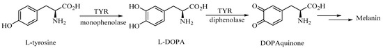 Biosynthetic pathway for melanin production: oxidation of L-tyrosine (monophenol) by tyrosinase (monophenolase) and subsequent oxidation of L-DOPA (o-phenols) to the corresponding quinone (diphenolase).