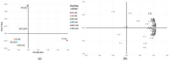 (a) Classification of wines after 18 months of barrel ageing by principal component analysis (PCA) according to volatile compounds analysed. (b) Contribution of variables in coordinate system defined by first two principal components (loading plot). LT: light toasting; MT: medium toasting; MLT: medium long toasting; SG: standard grain size; EG: extra fine grain size. 1: 1-hexanol; 2: Z-3-hexenol; 3: E-3-hexenol; 4: E-2-hexenol; 5: Z-2-hexenol; 6: 1-propanol; 7: 2-octanol; 8: isobutanol; 9: 1-butanol; 10: isoamyl alcohol; 11: 3-methyl-1-pentanol; 12: 2,3-butanediol; 13: 3-methyltiopropanol; 14: benzyl alcohol; 15: 2-phenylethanol; 16: α-ionone; 17: β-ionone; 18: β-damascenone; 19: Terpinolene; 20: α-terpineol; 21: trans-geraniol; 22: cis-geraniol; 23: β -citronellol; 24: linalool; 25: β-pinene; 26: 4-carvomenthenol; 27: citral; 28: ethyl butyrate; 29: Ethyl 2-methylbutyrate; 30: ethyl decanoate; 31: ethyl isovalerate; 32: ethyl myristate; 33: methyl salicylate; 34: hexyl acetate; 35: methyl vanillate; 36: ethyl vanillate; 37: ethyl hexanoate; 38: ethyl lactate; 39: ethyl octanoate; 40: diethyl succinate; 41: isoamyl acetate; 42: 2-phenylethyl acetate; 43: propanoic acid; 44: geranic acid; 45: nerolic acid; 46: pentanoic acid; 47: isobutyric acid; 48: 2-methylbutyric acid; 49: hexanoic acid; 50: octanoic acid; 51: butyric acid; 52: acetic acid; 53: isovaleric acid; 54: γ-butyrolactone; 55: acetoin; 56: benzaldehyde; 57: hexanal; 58: vanillyl acetone; 59: furfural; 60: 5-methylfurfural; 61: furfuryl alcohol; 62: cis-whiskey-lactone; 63: trans-whiskey-lactone; 64: 4-vinylphenol; 65: 4-vinylguaiacol; 66: eugenol; 67: guaiacol; 68: 4-ethylphenol; 69: vanillin.