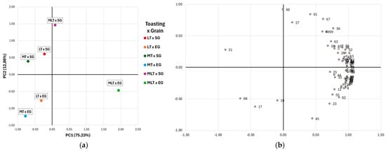 (a) Classification of wines after 12 months of barrel ageing by principal component analysis (PCA) according to volatile compounds analysed. (b) Contribution of variables in coordinate system defined by first two principal components (loading plot). LT: light toasting; MT: medium toasting; MLT: medium long toasting; SG: standard grain size; EG: extra fine grain size. 1: 1-hexanol; 2: Z-3-hexenol; 3: E-3-hexenol; 4: E-2-hexenol; 5: Z-2-hexenol; 6: 1-propanol; 7: 2-octanol; 8: isobutanol; 9: 1-butanol; 10: isoamyl alcohol; 11: 3-methyl-1-pentanol; 12: 2,3-butanediol; 13: 3-methyltiopropanol; 14: benzyl alcohol; 15: 2-phenylethanol; 16: α-ionone; 17: β-ionone; 18: β-damascenone; 19: Terpinolene; 20: α-terpineol; 21: trans-geraniol; 22: cis-geraniol; 23: β -citronellol; 24: linalool; 25: β-pinene; 26: 4-carvomenthenol; 27: citral; 28: ethyl butyrate; 29: Ethyl 2-methylbutyrate; 30: ethyl decanoate; 31: ethyl isovalerate; 32: ethyl myristate; 33: methyl salicylate; 34: hexyl acetate; 35: methyl vanillate; 36: ethyl vanillate; 37: ethyl hexanoate; 38: ethyl lactate; 39: ethyl octanoate; 40: diethyl succinate; 41: isoamyl acetate; 42: 2-phenylethyl acetate; 43: propanoic acid; 44: geranic acid; 45: nerolic acid; 46: pentanoic acid; 47: isobutyric acid; 48: 2-methylbutyric acid; 49: hexanoic acid; 50: octanoic acid; 51: butyric acid; 52: acetic acid; 53: isovaleric acid; 54: γ-butyrolactone; 55: acetoin; 56: benzaldehyde; 57: hexanal; 58: vanillyl acetone; 59: furfural; 60: 5-methylfurfural; 61: furfuryl alcohol; 62: cis-whiskey-lactone; 63: trans-whiskey-lactone; 64: 4-vinylphenol; 65: 4-vinylguaiacol; 66: eugenol; 67: guaiacol; 68: 4-ethylphenol; 69: vanillin.
