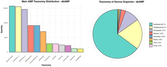 Main taxonomic distribution of antimicrobial peptides and the taxonomic classification of source organisms of these peptides in the dbAMP database.