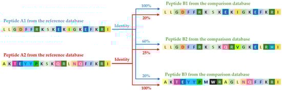 For example, sequence A1 from the reference database is compared sequentially with all sequences in the target database: A1 with B1 (100% match), A1 with B2 (60% match), and so on. Then, this process is repeated for the next sequence from the reference database, for instance, A2 with B1 (20% match), A2 with B2 (25% match), etc., (Figure 3).