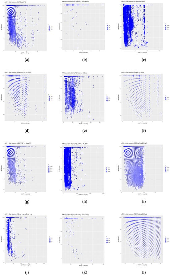 Distribution plots of peptide similarity for a given length for self-comparison of databases: (a) APD, (b) BaAMPs, (c) CAMP, (d) CancerPPD, (e) CyBase, (f) dadp, (g) DBAASP, (h) dbAMP, (i) DRAMP, (j) InverPep, (k) ParaPep, and (l) SATPdb. The X-axis represents AMP size in amino acid count and the Y-axis % identity is calculated using diamond. The size of the point is proportional to the frequency of the result obtained.