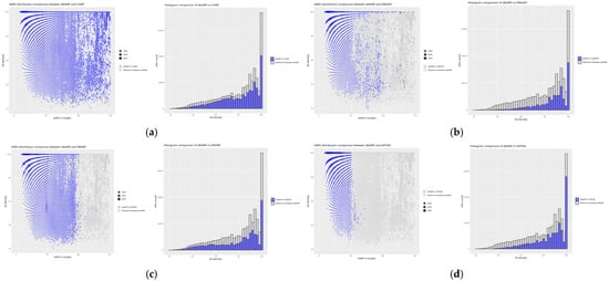 Distribution plots of peptide similarity for a given length for comparison of the reference database with databases with the least similar sequence counts, as well as histograms for each comparison: (a) dbAMP vs. BaAMPs, (b) dbAMP vs. dadp, (c) dbAMP vs. InverPep, and (d) dbAMP vs. ParaPep. Similarly to the previous figures, the blue values represent those derived from the comparison of the reference database with a given database, while the gray values correspond to the self-comparison of the reference database. Here, as well, gray values dominate the plots, as the databases compared in this set contain significantly fewer sequences than the reference database. For the scatter plots, the X-axis represents AMP size in amino acid count, the Y-axis % identity is calculated using diamond. The size of the point is proportional to the frequency of the result obtained. For the histogram plots, the X-axis represents % identity as calculated using dimond, the Y-axis ‘hit counts’.