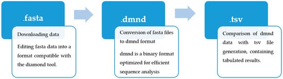 In the next step, the data stored in the fasta format were converted into the dmnd format. The dmnd format is a binary structure optimized for fast homology searching in large databases. Compared to traditional text formats such as fasta, dmnd is much more efficient in terms of data storage and processing. Its compactness reduces file sizes, which shortens read and write times. Furthermore, this format includes built-in indexes that enable rapid searching and sequence comparison, making it extremely useful in bioinformatics analyses involving large datasets.