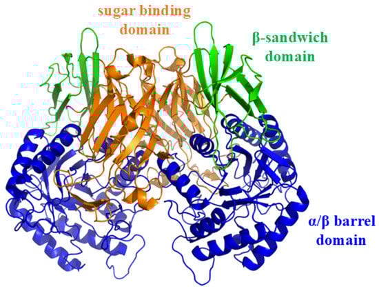 GUS (EC 3.2.1.31) belongs to glycosyl hydrolase (GH) families 1, 2, 30, 79, and 154, which are widely distributed in mammalian tissues, body fluids, and gut microbiota [3]. Gut bacterial GUS plays a critical role in hydrolyzing large amounts of endogenous glucuronides and in reactivating various drugs and xenobiotics, including CPT-11 and non-steroidal anti-inflammatory drugs (NSAIDs) [4]. In 2010, Wallace et al. elucidated the crystal structure of Escherichia coli GUS (EcGUS) [5], which was shown in Figure 1. The structure comprises two asymmetric subunits, each containing approximately 597 amino acids. The 180 residues at the N-terminus are similar to the sugar-binding domain of GH family 2. Amino acid residues 274–603, located at the C-terminus, form an α/β barrel domain and include the catalytic active residues Glu413 and Glu504. Bacterial loops formed by 17 amino acid residues (360–376) are also present at the C-terminus. The third domain, located between the N- and C-terminus, exhibits an immunoglobulin-like β-sandwich structure.