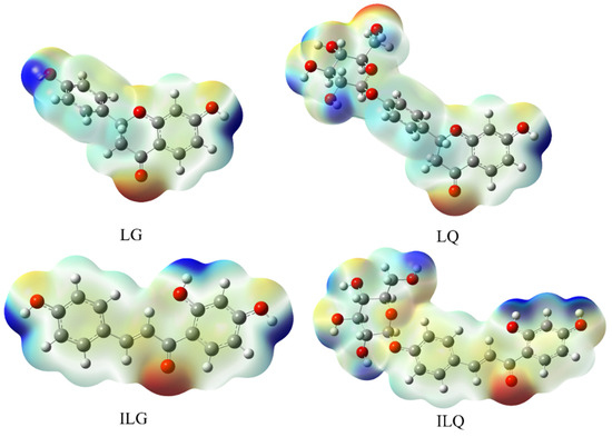 Calculated molecular electrostatic potential surfaces of the optimized structures of LG, LQ, ILG, and ILQ derived from licorice. The positive MEPs (colored in blue), the negative ones (colored in red).