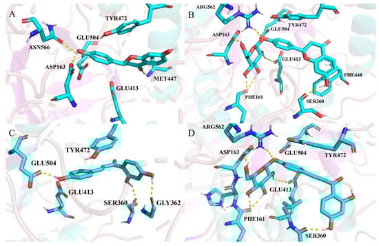 Docking results for the LG-GUS (A), LQ-GUS (B), ILG-GUS (C), and ILQ-GUS (D) systems. Ligands and important amino acids are shown as stick diagrams (carbon atoms in cyan, oxygen atoms in red and nitrogen atoms in blue), while EcGUS is represented by a ribbon diagram. Hydrogen bond interactions are indicated by yellow dashed lines. Hydrogen bond is defined as the distance between the acceptor and donor atoms < 3.5 Å, with an internal angle between the H-acceptor and H-donor > 120°.