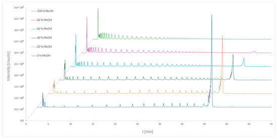 Many applications have been published in the scientific literature using a gradient elution mixture of acetonitrile and an appropriate buffer—typically ammonium formate [1,19,20]. In general, a high amount of organic modifier shifts the distribution of polar organic compounds toward the aqueous diffusion layer and therefore increases their retention. Acetonitrile does not influence just the partitioning of analytes, but through changes to the ionic strength of a particular mixture, influences possible additional polar interaction with the stationary phase as well. The application of methanol as an alternative organic modifier is quite common in classical reverse phase chromatography, but only limited studies were reported using it as organic modifier in HILIC separation [21].