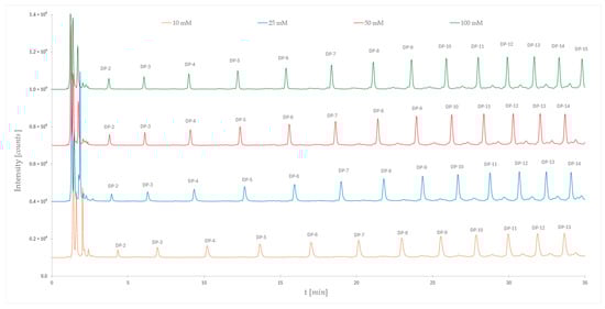 By adding methanol to the organic phase, the elution strength of the eluent is increased without changing the gradient. For example, with 20% methanol in acetonitrile, sugars with degrees of polymerization (2 ≤ DP ≤ 21) can be completely separated. If the methanol content is further increased to 40%, sugars with degrees of polymerization (2 ≤ DP ≤ 30) can be separated. Even at higher methanol concentrations, the separation shifts further: sugars with the lowest degrees of polymerization elute in the dead volume, but it enables the separation of sugars with higher degrees of polymerization. Based on peak counting and a minimum signal-to-noise ratio (S/N) of 5, we observe that sugars with degrees of polymerization exceeding DP = 50 are still detectable. The noise level was manually assessed in the range between 32 and 35 min to ensure accurate detection limits. It is also noticeable that as the methanol content increases, the peak at the end of the chromatogram diminishes and almost disappears at 100% methanol. This indicates that sugars with the highest degrees of polymerization are all separated, while those with lower DP elute in the dead volume or are eluted before the mentioned rising buffer concentration reaches 100% (Figure 1).