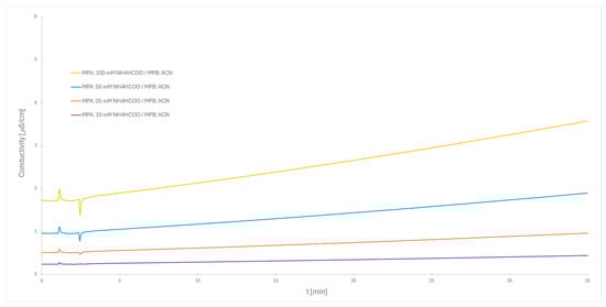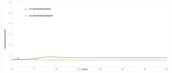 One can see that changes in the conductivity readings are much lower than before. The changes are smaller when methanol is used as the organic phase compared to acetonitrile. The observed small changes in conductivity are not connected to changes in buffer concentration but are caused by changes in ion mobility and possible dissociation of the buffer. The acetonitrile is an aprotic solvent, and salts can be solubilized in such a solvent as ion pairs, which do not contribute to the conductivity since they are acting as neutral [26,28]. During the gradient separation process, the concentration of acetonitrile is slowly reduced and buffer salts become solubilized in water where they act as classical completely dissociated molecules, resulting in a slow increase in conductivity. The same effect is not visible in methanol mixtures.