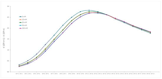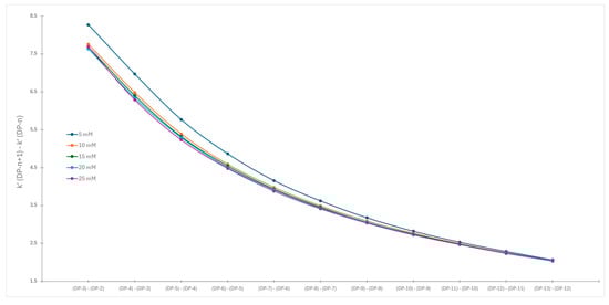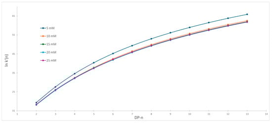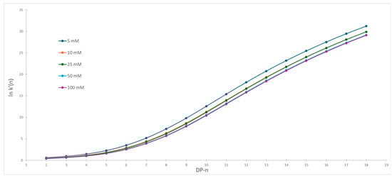 In the first case, one can assume the presence of the same retention mechanisms, either a single one or several, during the whole chromatographic runs. We can see a steady decline in differences of capacity factors of consecutively eluted chromatographic peaks. Such observation is caused by the linear increase of elution power of the mobile phase, as the differences in the physical properties of the eluted compounds are becoming smaller. The same pattern was observed for all buffer concentrations. Steady unidirectional changes were observed also in Figure 7, where the first derivative of changes in capacity factors vs. degree of polymerization is presented. Since the physical properties of dextrans change in a similar manner, that is, initial changes in physical properties are large and then decrease with the increased DP, the obtained results are expected.