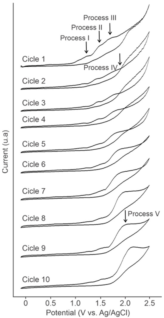 From the eighth cycle onwards, a broad oxidation peak at 2.03 V is observed (process V) which may be due to oxidation processes of the fragments, generation of organic acids, and the growth or increase in the amount of polymer generated. The oxidation processes of phenol, the formation of intermediates and the polymerization process were reported in previous studies [24,25,26].